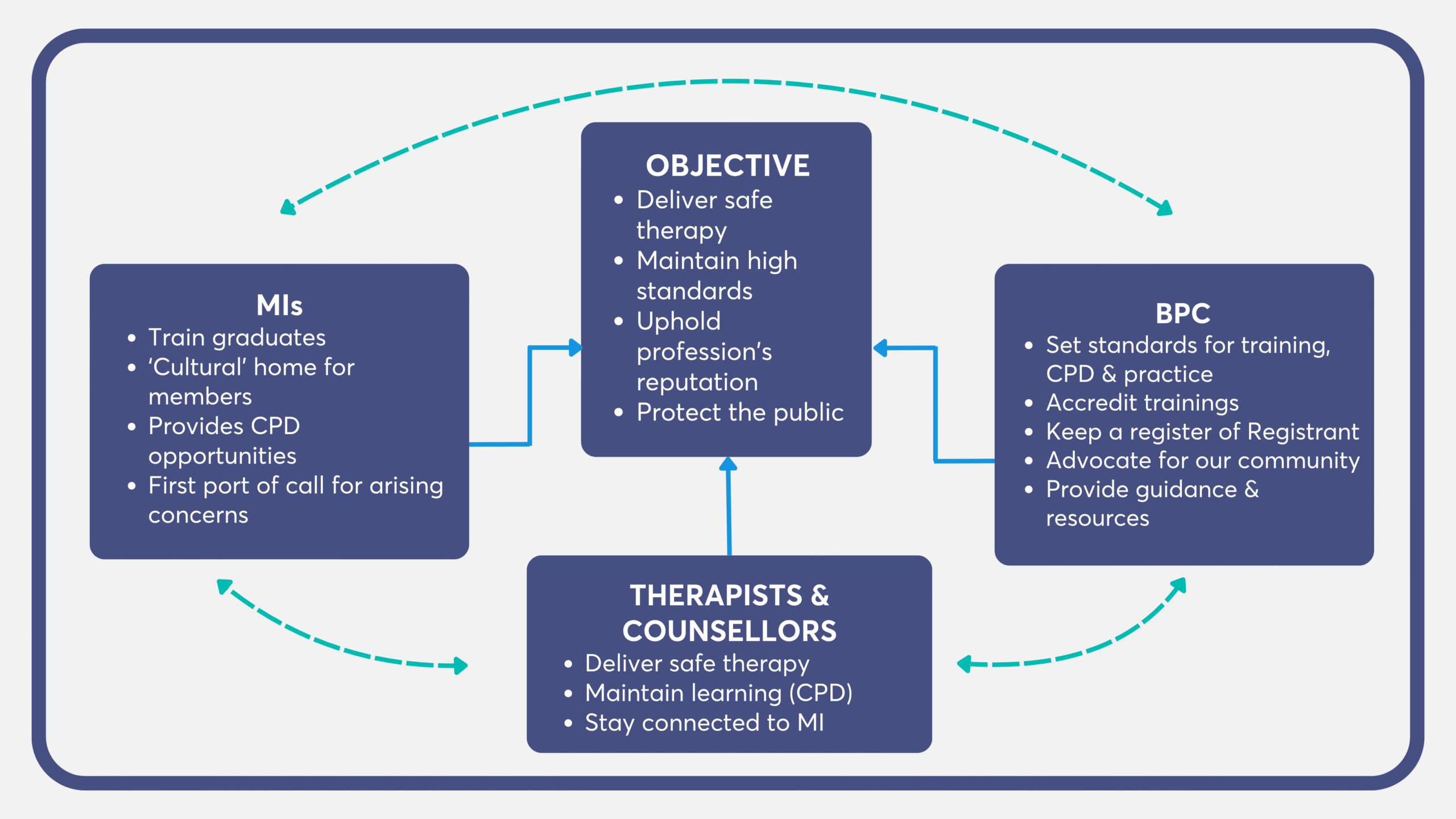 All of our Registrants have to be registered with an MI where they have trained. This is also where they may continue their learning through CPD and supervision groups. Our MIs play a very important part within our regulatory model as they help foster relationships within the profession as well as a healthy professional environment for practitioners. The MI is also instrumental when concerns are raised to support the Fitness to Practice process alongside us.